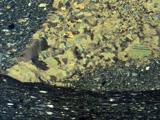 • Abb. 5: "Karbonatnester" im Schiefer. Sehr schön sind die für Calcit typischen Zwillingsbildungen zu sehen. (Bildbreite = 4,9 m)