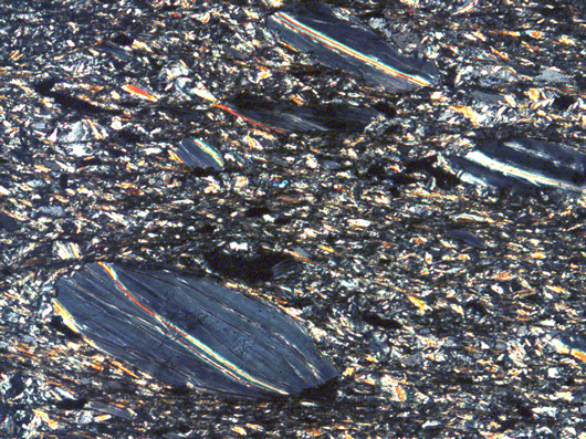 • Abb. 3.: Chloritblasten mit gekreuzten Nichols. Sehr schön ist