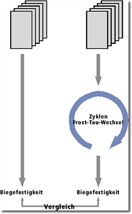 In diesem Test wird mit 20 Paaren an Prüfkörpern die Veränderung der Biegefestigkeit nach der Durchführung des Frost-Tau-Wechsels festgestellt. Die 20 Paare sind in zwei Gruppen aufzuteilen, wobei von 10 Paaren die Biegefestigkeit ohne vorhergehende Beanspruchung analysiert wird. Die anderen 10 Paare müssen insgesamt 100 Frost-Tau-Wechsel-Zyklen ausgesetzt werden. Anschließend wird die Biegefestigkeit und deren mögliche Veränderung festgestellt. Jetzt werden die Biegefestigkeiten der jeweiligen 10 Paare verglichen.