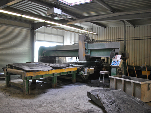 Abb. 1: Gewonnene Schieferblöcke werden zu "Schieferbüchern" gesägt. "Schieferbücher" sind Blöcke die in Länge und Breite etwas größer als die endgültigen Schiefer sind (Fa. Magog, Sauerland).