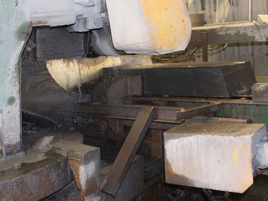 Abb. 3: Gewonnene Schieferblöcke werden zu "Schieferbüchern" gesägt. "Schieferbücher" sind Blöcke die in Länge und Breite etwas größer als die endgültigen Schiefer sind (Hilltop Slate, Bundesstaat New York, USA).