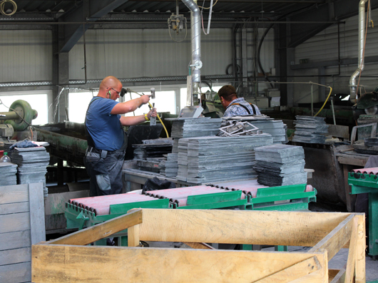 Die Schieferblöcke können unmittelbar an der Grube zu "Schieferbüchern" gesägt werden, um dann zur Produktionshalle transportiert zu werden. "Schieferbücher" sind Blöcke die in Länge und Breite etwas größer als die endgültigen Schiefer sind. Es können aber auch alle Produktionsschritte an einem Platz erfolgen.
