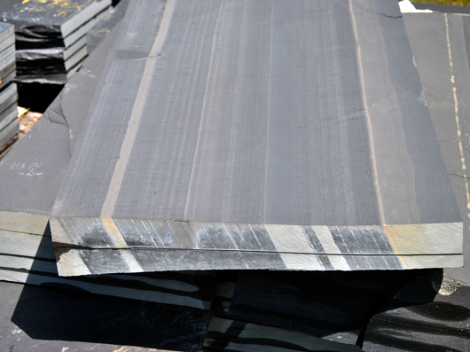 Die Farbgebung der Schiefer schwankt zwischen grau, grau-schwarz und blau-schwarz. Während die ,soft slates` sowohl für die Produktion von Dachschiefer als auch von Schiefermehl abgebaut werden, kommen die ,lower hard slates` als Dachschiefer und Bodenplatten zum Einsatz.