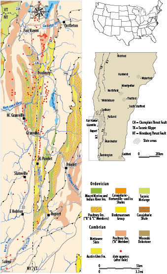 Da sich die wirtschaftlich wichtigsten Schiefer im westlichen Schiefergürtel ("slate belt") befinden, soll nur auf sie eingegangen werden. Sie gehören zu den nördlichen Appalachen und befinden sich an der westlichen Flanke der Green Mountains, in der 400-500 m hohen Taconischen Kette bzw. Taconic Range. Die Green Mountains bestehen aus präkambrischen Gneisen und Glimmerschiefern, die östlich wie westlich von paläozoischen Sedimenten flankiert werden (Balk, 1953).
