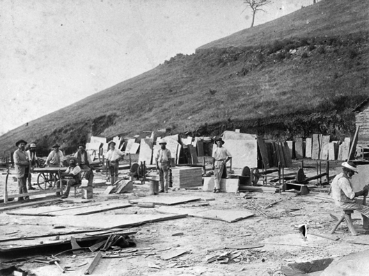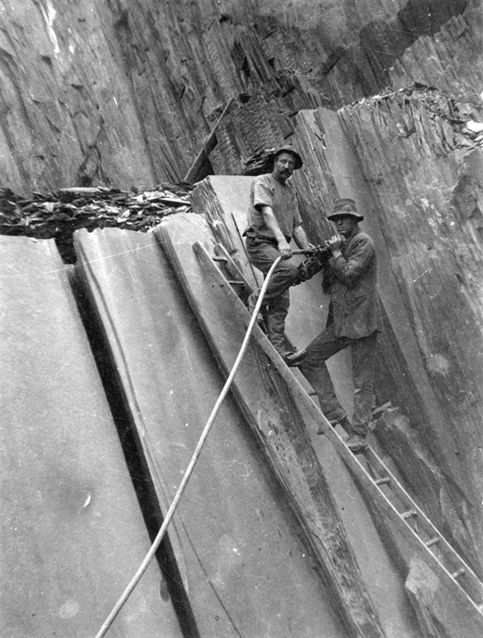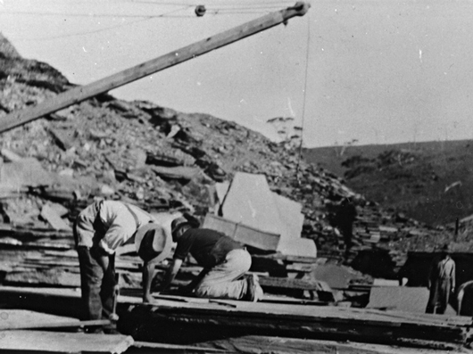 Abb. 3 WILLUNGA: Bergleute beim Bearbeiten eines Schieferblocks in den "Bangor slate quarries", welche unter dem Namen "Australian Slate Quarries Ltd" firmierten (1921).