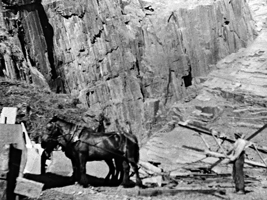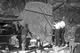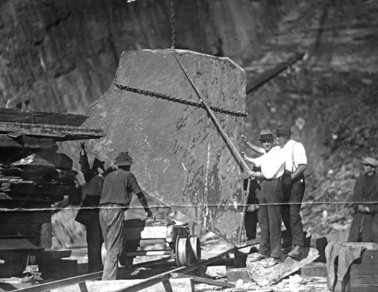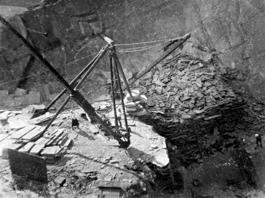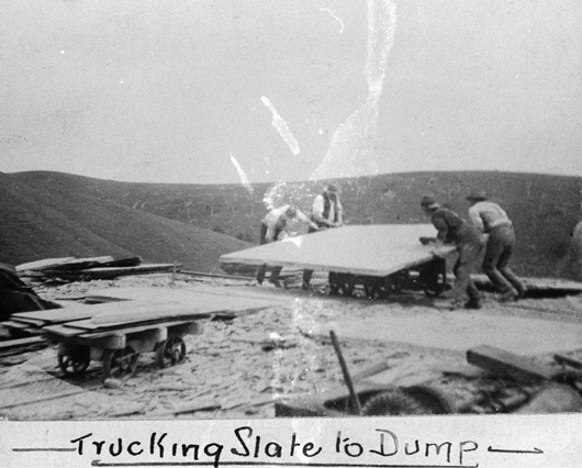 Abb. 6 Männer transportieren eine große Schieferplatte zum Lager ('dump' steht eigentlich für Halde, aber auch für Lager, was hier wahrscheinlicher ist (ca. 1920).